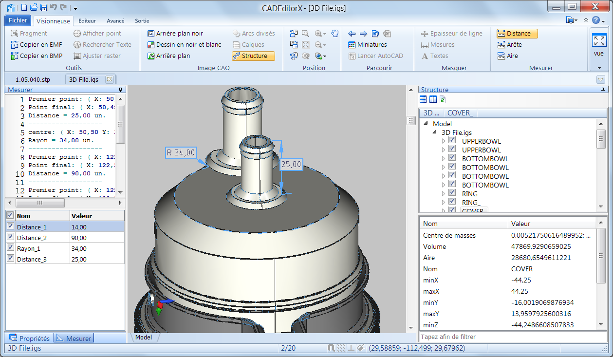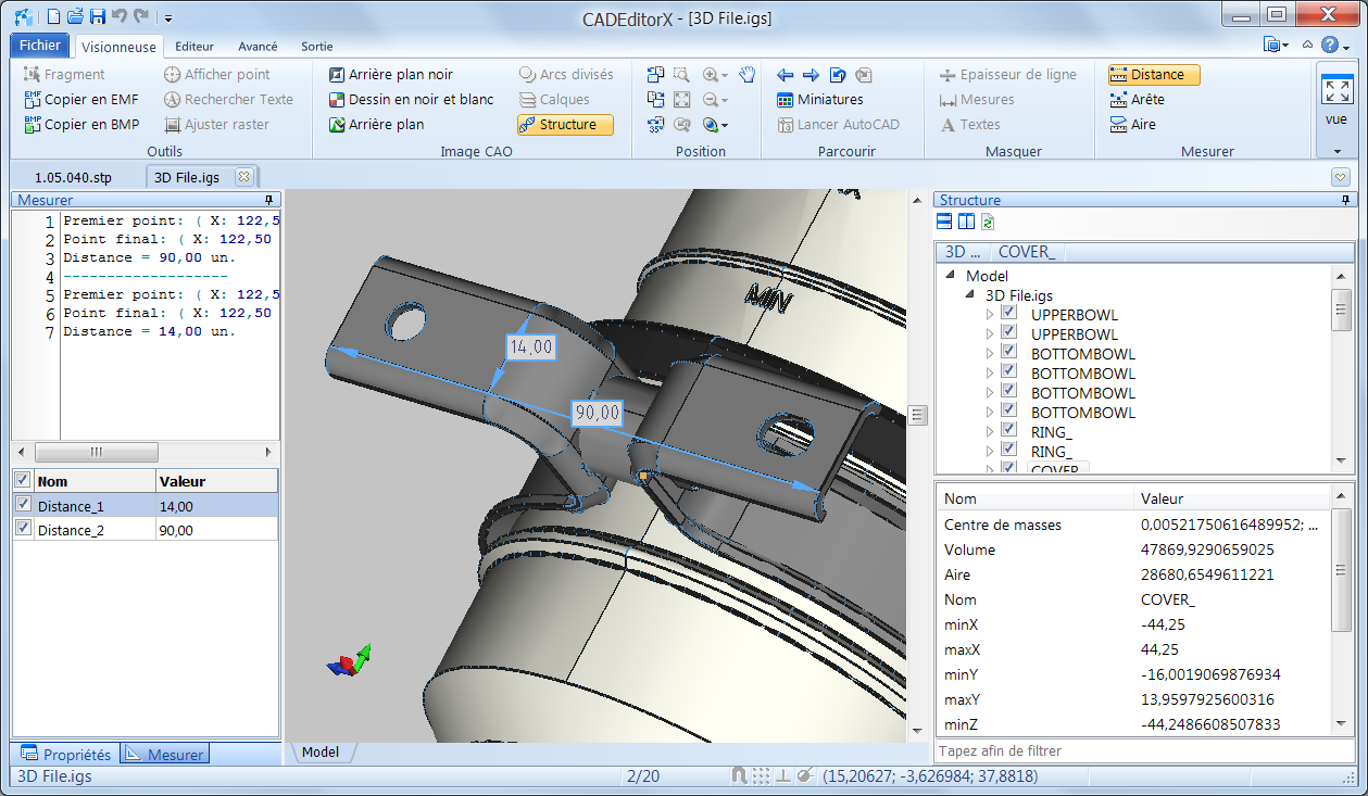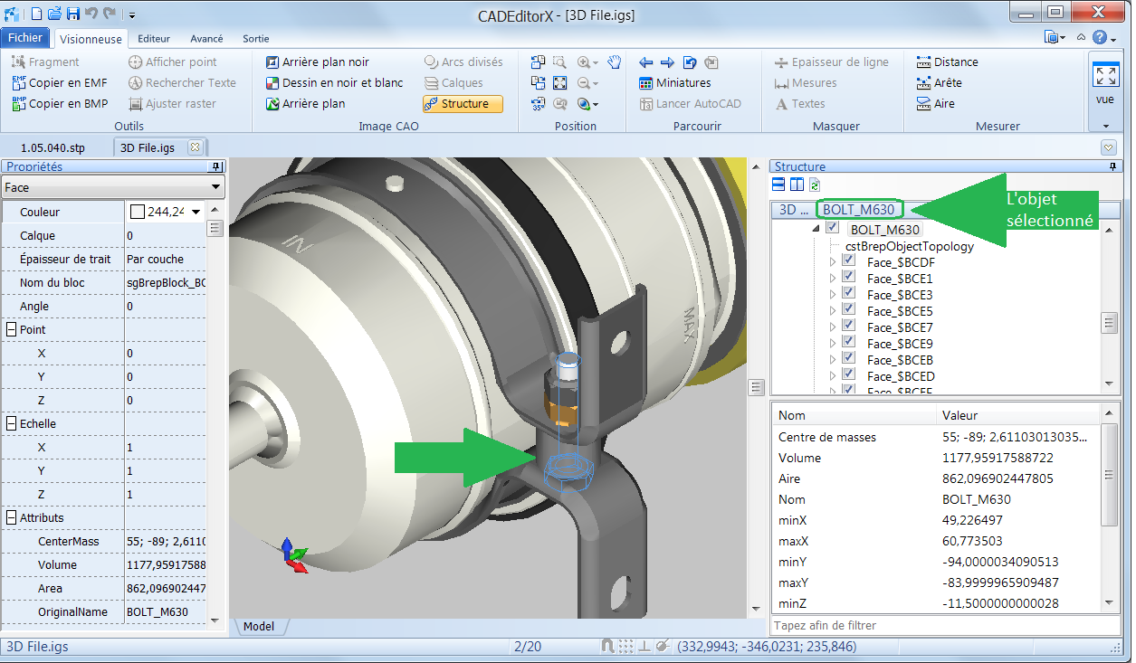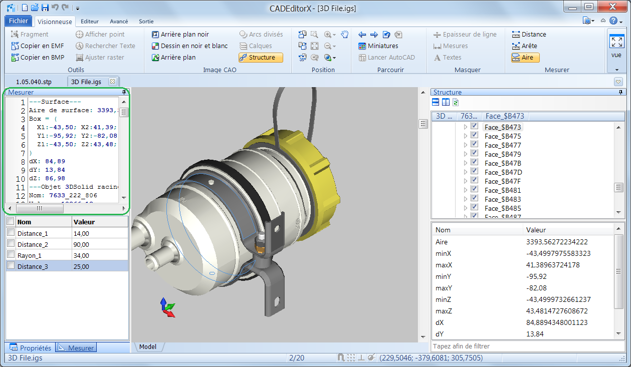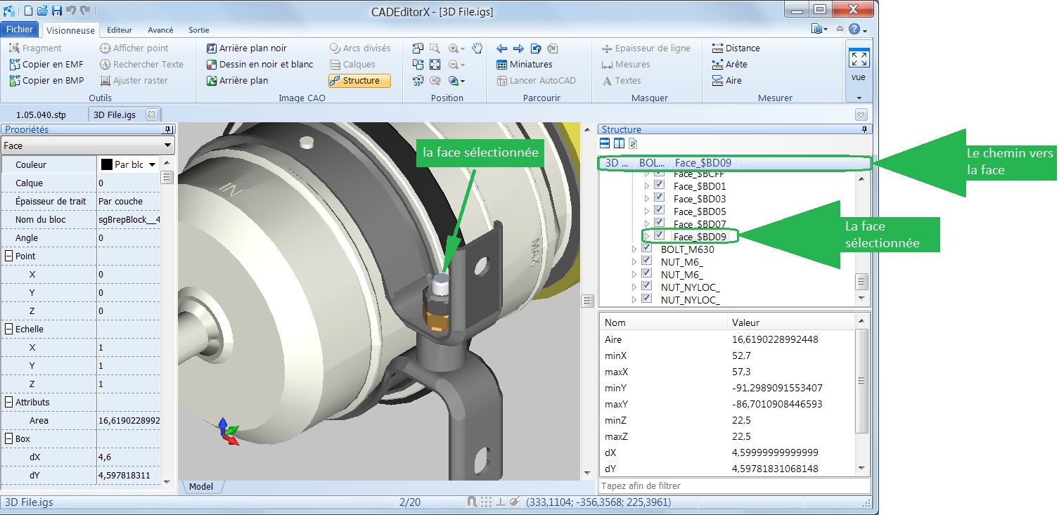 Dans les fichiers STEP et IGES des objets peuvent être groupés. CADEditorX User Interface affiche les dimensions d'encombrement pour la surface (face) d'une pièce et pour le groupe la contenant. Pour obtenir les dimensions d'une pièce :