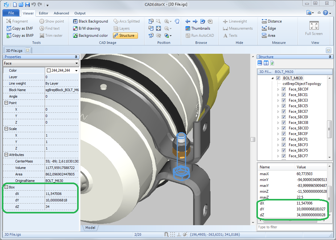 Pour obtenir les informations sur les cotes d’extrémité à extrémité du modèle complet, faites utiliser l'outil Rectangle englobant, situé sur l'onglet Visionneuse 3D dans la section Styles visuels. Dans les fichiers 3D les objets de modèle 3D peuvent être combinés en groupe. CADEditorX User Interface affiche les cotes d’extrémité à extrémité pour la surface (la face) de la pièce et pour le groupe où la pièce fait partie.