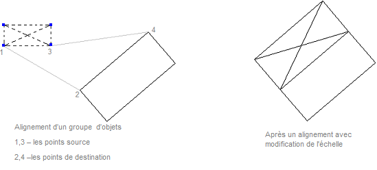 La distance entre premier et second point de destination est une distance de référence qui permet de mettre les objets sélectionnés à l’échelle et de les aligner en même temps.