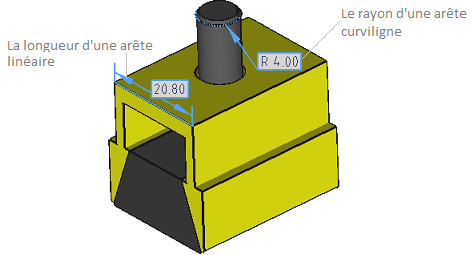 L'outil Arête permet de mesurer une arête linéaire ou un rayon d'une arête curviligne d'un modèle 3D dans les modes d'affichage Ombrage plat, Ombrage lisse et Lignes cachées.