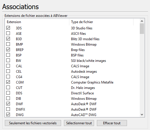 •Sélectionner tout. Active l’association avec tous les formats pris en charge dans CADEditorX User Interface.