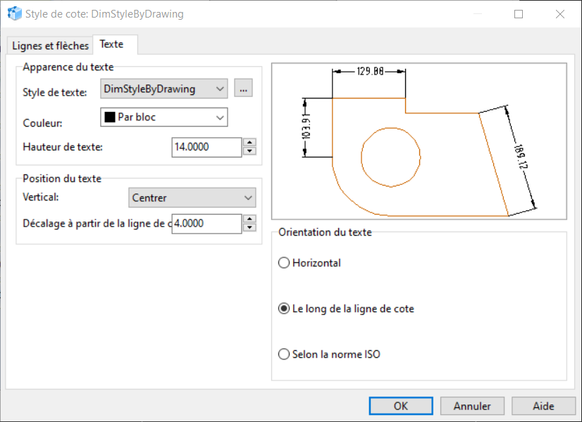 Le groupe Orientation du texte permet de sélectionner l'alignement du texte de cote :