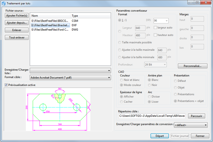 Nous allons convertir deux fichiers DWG et un fichier DXF en PDF. On sélectionne la commande Traitement par lots… dans l’onglet Sortie et ajoute des fichiers de dossiers différents à la liste. On spécifie PDF comme format de sortie.