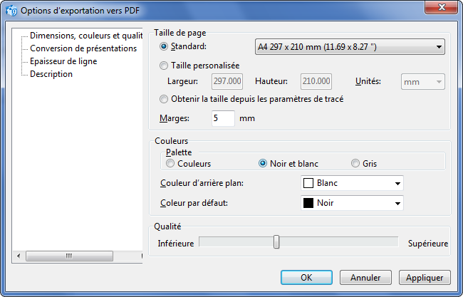 On spécifie les réglages de la conversion. On clique sur le bouton Personnalisé et sélectionne l’option Noir et blanc dans la section Couleurs de la boîte de dialogue qui s’ouvrira. La taille de présentation sera spécifiée en fonction des paramètres du tracé car les fichiers de départ sont DXF et DWG.