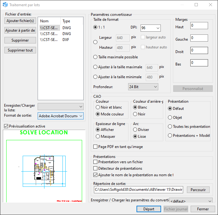 Nous allons convertir deux fichiers DWG et un fichier DXF en PDF. On sélectionne la commande Traitement par lots… dans l’onglet Sortie et ajoute des fichiers de dossiers différents à la liste. On spécifie PDF comme le format de sortie.