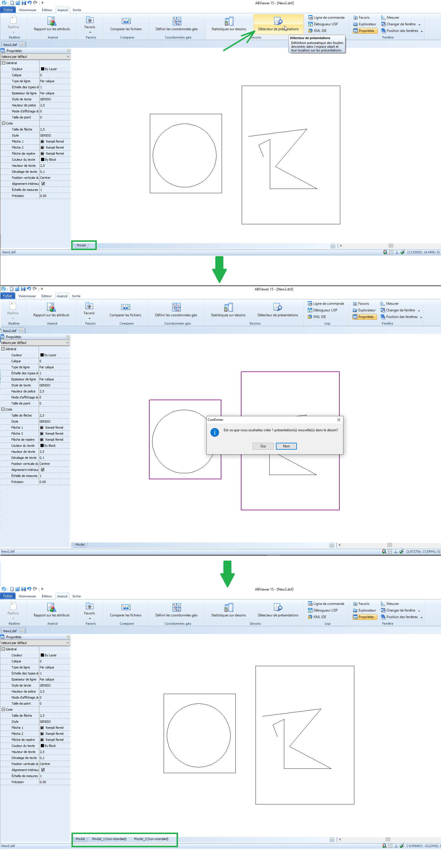 L'outil Détecteur de présentations définit les feuilles dessinées dans l'espace objet automatiquement et puis il les réparit dans les présenations.