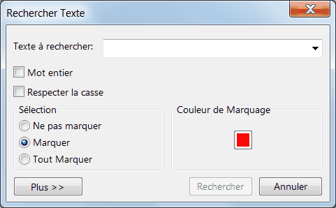 L'outil Rechercher le texte permet de trouver une chaîne de texte selon des critères spécifiés. La sélection de la commande Rechercher le texte appelle la boîte de dialogue Rechercher texte. Un clic sur le bouton [Plus>>] ouvre les paramètres supplémentaires de la recherche. Le nom du bouton se transforme dans [<<Moins]. Si les paramètres supplémentaires de la recherche sont ouverts ils influent la recherche. C'est pourquoi il est recommandé de masquer les options supplémentaires si le nom de la police et la hauteur sont inconnus, cad si même un seul critère ne coïncide, la chaîne de texte ne sera pas trouvée.