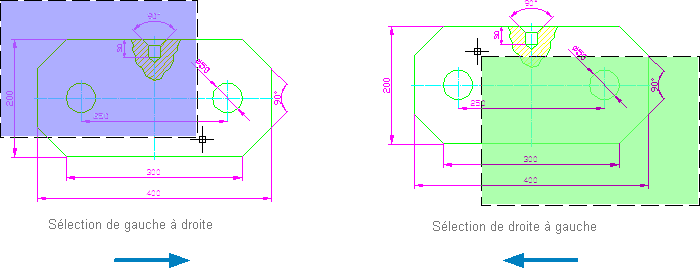 Si le rectangle de sélection est créé de droite à gauche et la couleur du rectangle de sélection est verte, tous les objets entourés et traversés par le rectangle sont sélectionnés.