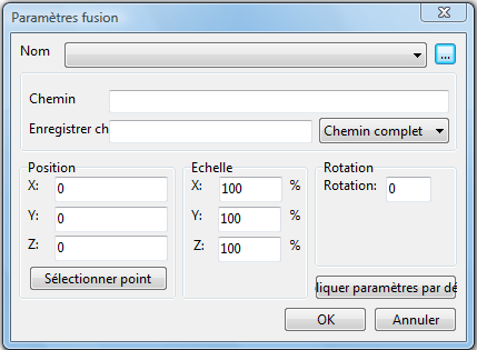 La boîte de dialogue Paramètres fusion a plusieurs groupes de réglages pour définir le dossier du fichier à insérer, sa position dans le dessin, l'échelle du dessin et l'angle de rotation à insertion.