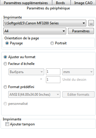 L'onglet Paramètres du périphérique contient des réglages du périphérique de sortie, définit l'orientation de la page et le format du papier, la dimension d'image imprimée et active / désactive le compte de zones non imprimées.