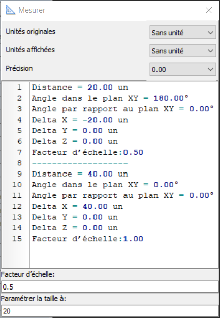 La fonction Paramétrer la taille à change aussi le facteur d'échelle, mais il est calculé en tant que rapport entre la valeur entrée et la valeur réelle de la distance mesurée.