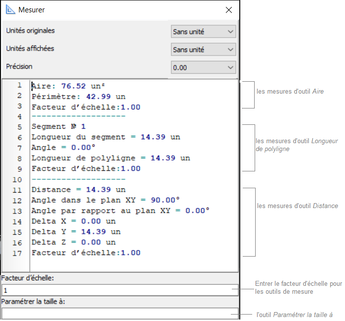 Les valeurs de mesures reçues dépendent du facteur d'échelle indiqué dans la boîte de dialogue Options sous l'onglet Mesurer. Il peut être calculé automatiquement ou indiqué par l'utilisateur. Le paramètre Unités affichées du dessin de la boîte de dialogue Options définit les unités de mesures dans le panneau. Il y a trois valeurs prédéfinies de ce paramètre : mètres, millimètres et pouces. Si l'échelle n'est pas standard, la valeur Sans unité est attribuée.