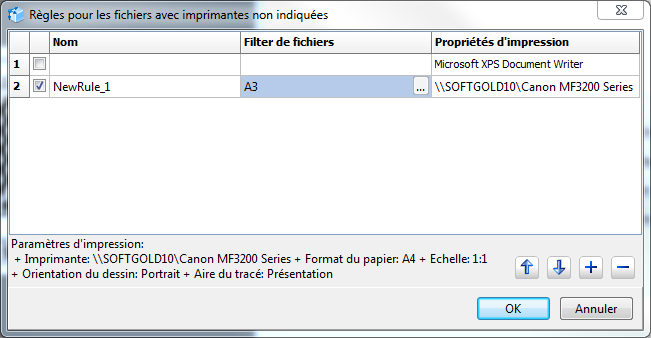 La boîte de dialogue Règles pour les fichiers avec imprimantes non indiquées est utilisée pour la création et édition des règles de l'impression.