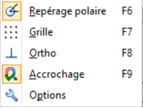 Le bloc avec des modes d'aide contient quatre boutons : Accrochage, Grille, Ortho et Repérage polaire. Une coche verte signifie que le mode est activé. Pour activer ou désactiver un mode, veuillez cliquer sur l'icône correspondante à l'aide du bouton gauche de la souris.