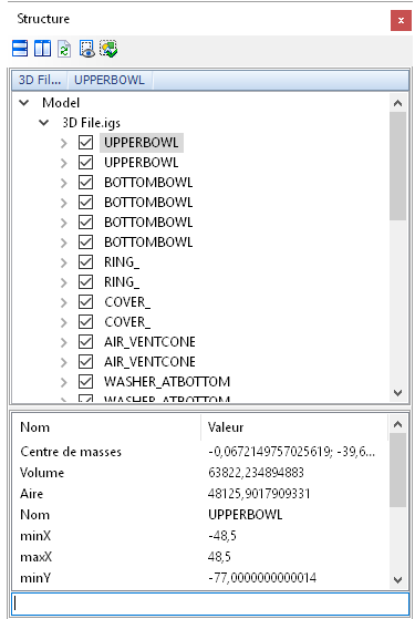 Dans les modes 3D la palette Structure affiche les objets du dessin en tant qu'arborescence. La palette est utilisée pour sélectionner les objets du dessin ; de visionner leurs propriétés et permet de gérer la visibilité des objets. Par défaut, la palette est ancrée au bord droit lors du passage en mode 3D.