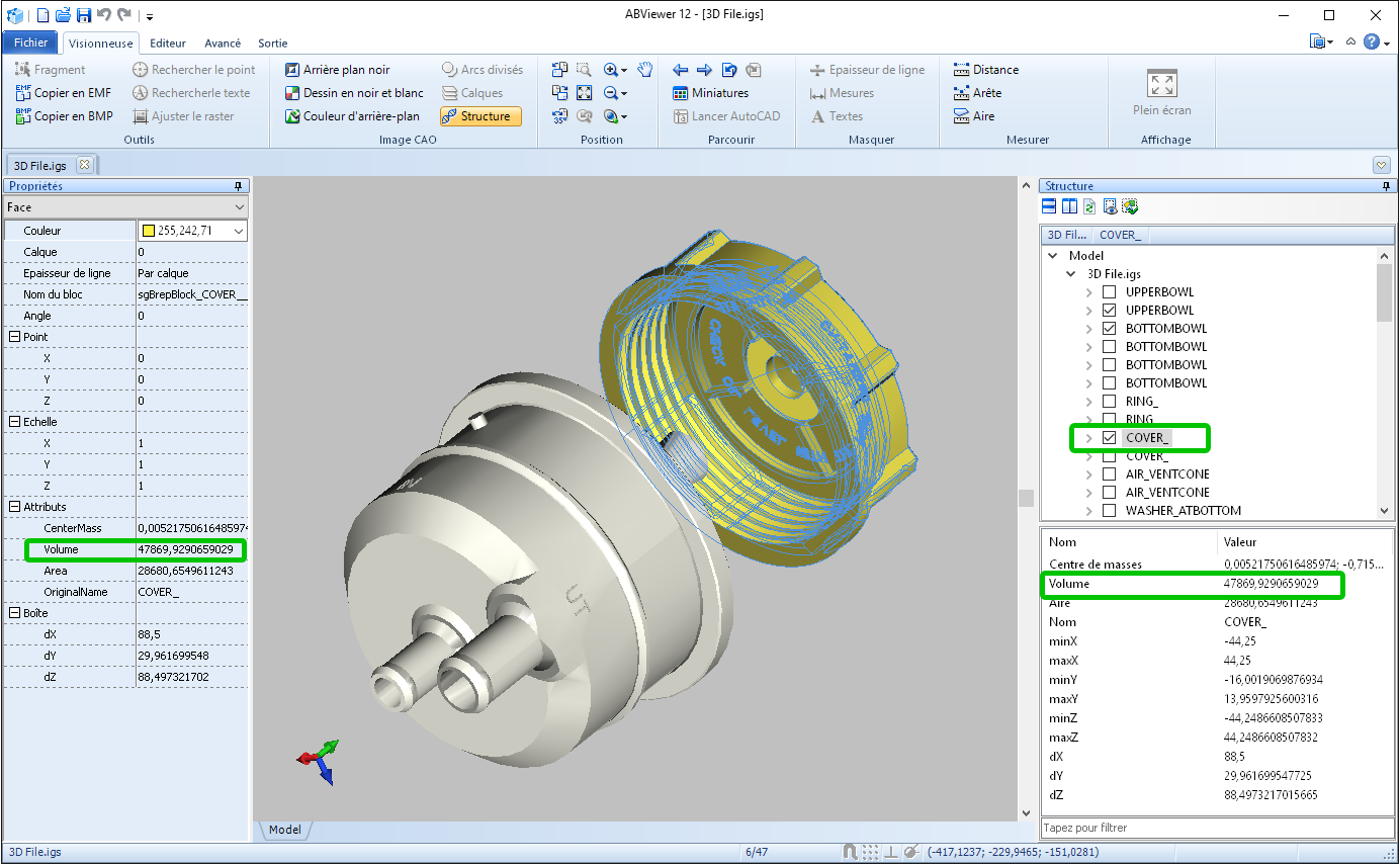 On peut aussi voir le volume du modèle 3D ou du groupe certain d'éléments du modèle dans la section Propriétés. Il faut sélectionner un élément ou un groupe d'éléments dont vous voulez savoir le volume dans l'arborescence d'objets. Le groupe sélectionné sera mis en évidence sur le dessin. Le volume du groupe d'éléments sélectionné sera affiché dans la section Propriétés.