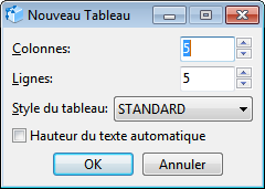 Tableau. Après la sélection d'une zone rectangulaire dans laquelle le tableau sera inscrit, la boîte de dialogue Nouveau Tableau apparaît, où les paramètres de départ sont entrés :