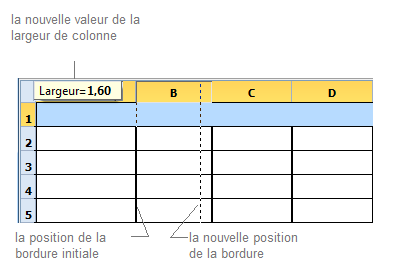 On peut redimensionner les colonnes ou lignes à l'aide de la souris et en tapant des valeurs dans le champ correspondants. Placez le curseur sur la bordure de cellules dans le champ de la ligne de noms. Après que le curseur change sa forme, modifiez la taille en maintenant le bouton gauche de la souris appuyé. Vous verrez la valeur courante du paramètre modifié.