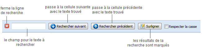 Pour passer à une cellule vous pouvez entrer son adresse dans le champ correspondant. Il est aussi possible de rechercher informations dans le contenu de cellules. Pour appeler la ligne de recherche cliquez dans l'espace du tableau à l'aide du bouton droit de la souris et sélectionnez la commande Rechercher ou utilisez un raccourci Ctrl+F. Vous verrez la ligne suivante en bas d'éditeur de tableau :