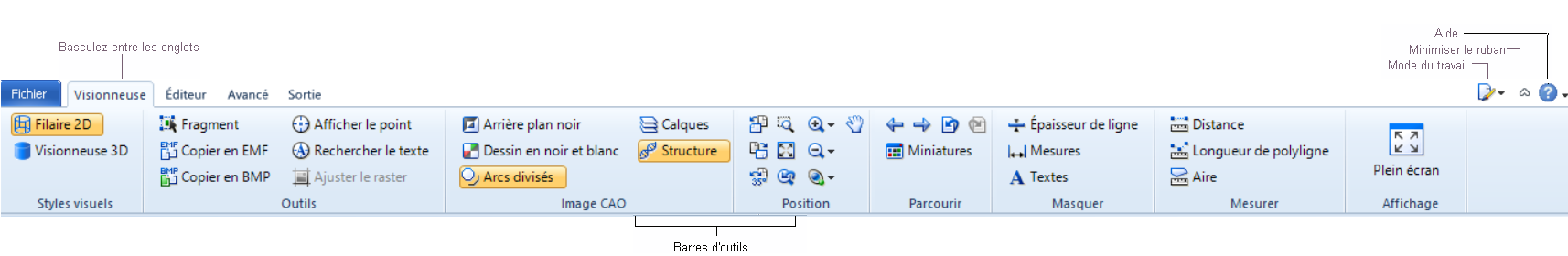 •L'onglet Visionneuse contient les outils d’affichage des fichiers permettant le positionnement, le mesure des dessins, etc.