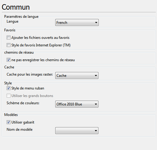 Cet onglet contient les réglages du style et de la langue du programme et permet d'activer l’utilisation des gabarits lors de la création de nouveaux fichiers.