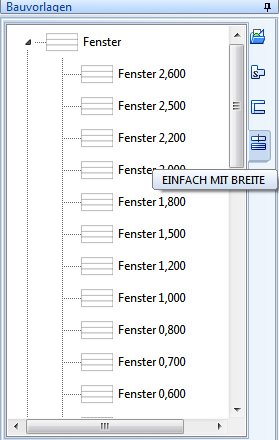 Es gibt vier Gruppen von Bauvorlagen. Alle Bauvorlagen werden standardmäßig als Liste angezeigt, es kann schwierig sein, die erforderliche Vorlage in dieser Liste zu finden. Man kann in diesem Fall nur einzelne Gruppe der Vorlagen mithilfe von Schaltflächen auf der rechten Seite der Palette öffnen, um die Suche nach einer erforderlichen Vorlage zu beschleunigen. Wenn man die Gruppe Einfach mit Breite auswählt z. B., werden nur Bauvorlagen dieser Gruppe angezeigt: